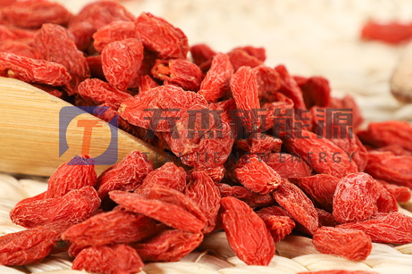 烘干枸杞的一階段是升速烘干階段。枸杞烘干機內溫度上升到35℃-40℃,循環(huán)風速2.3米/秒,溫度37℃-45℃。循環(huán)風速1.3米/秒時,熱風的傳遞和新鮮枸杞游離水分的擴散蒸發(fā)加快,尤其是枸杞皮層失水多達50%,表皮出現曲皺,新鮮枸杞內含結構水也從皮層氣孔開始慢慢滲出蒸發(fā),次期的升速脫水,枸杞內糖分濃度增加,抑制了果內成分的活性,保護了多糖、維生素、氨基酸等主要成分不被轉化或損失,尤其對紅色素保護好,烘干的果實色紅質量高。