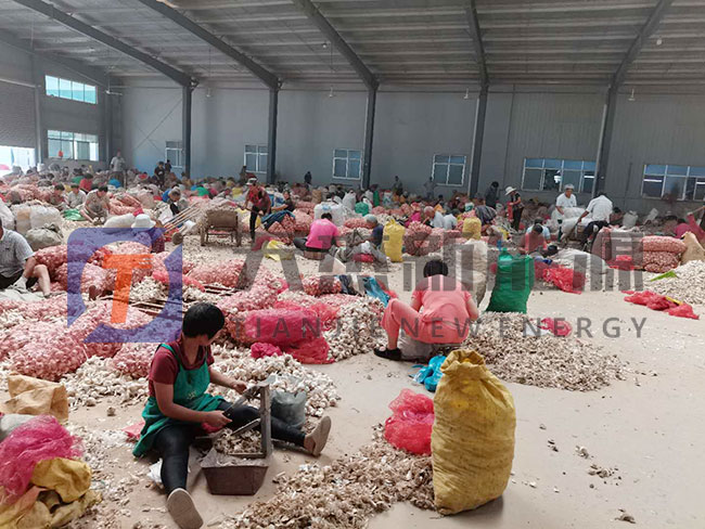 二、分瓣后,蒜瓣和外表皮是混合在一起的,那么如何把它們分開呢,用鼓風(fēng)機(jī)產(chǎn)生的強(qiáng)大風(fēng)力。因?yàn)樗獍甑谋戎乇人馄ご?,也就是說(shuō)蒜瓣重,外表皮輕,用風(fēng)力可將蒜皮除去。沒(méi)有除去的蒜皮還要人工挑出。