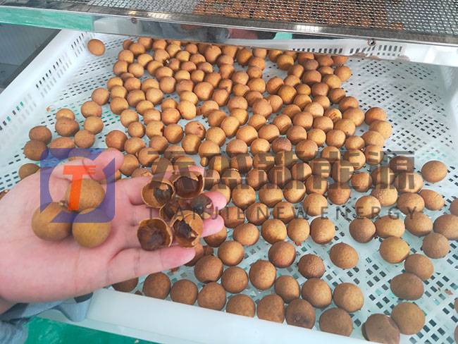 天杰新能源?;葜蔟堁酆娓蓹C(jī)開機(jī)大吉 將清理好的新鮮龍眼放入托盤送入 龍眼烘干機(jī) 內(nèi) 設(shè)置好小型家用龍眼烘干機(jī)的烘干參數(shù)開始進(jìn)行烘干 被龍眼烘干機(jī)加工后的成品展示