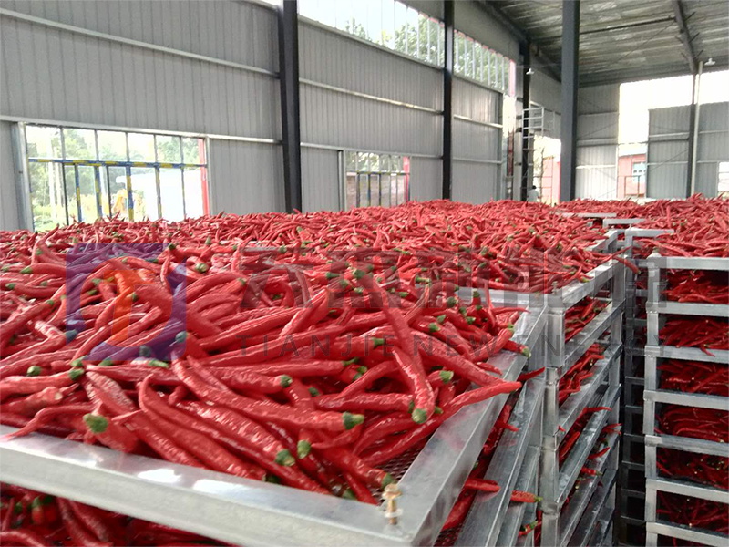 一、辣椒烘干房使用流程:用戶在使用辣椒烘干房烘干辣椒的時候,將辣椒均勻平鋪在托盤上,統(tǒng)一放置在小推車上的托盤架,然后推入烘干房準備烘干,烘干房是采用箱式烘干結構,內部有熱風循環(huán)系統(tǒng)和自動溫、濕度控制系統(tǒng),可以對烘干房內的物料烘干,溫度控制都可以很好的控制。
