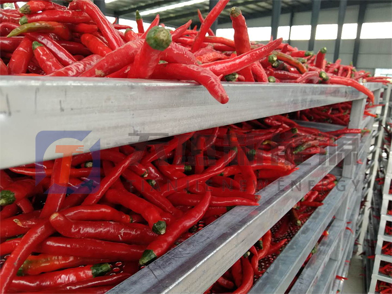 辣椒推入烘干房之后,我們根據(jù)不同的烘干要求,設置相應的烘干參數(shù),同時在烘干過程中根據(jù)實際情況,做出相應的烘干調整。辣椒烘干過程不需要進行翻動,直到烘干完成。烘干一批次之后,進行下一批次的烘干。這種適用于家用,種幾畝地的農戶。