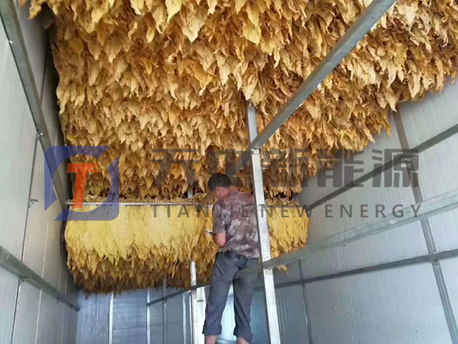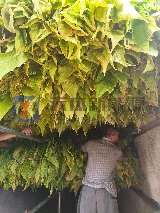 前期煙葉編裝的時候要使煙葉間距平均,有利于熱風進行循環(huán),這樣煙葉各部分才能受熱均勻,在綁桿的時候需要遵循一個原則,成熟稍差的煙葉放在溫度低的地方,成熟的煙葉放在中間層,過熟的煙葉放在溫度高的地方,當天采收的煙葉當天進入煙草烘干烤房。煙葉烘干的前期為變色期,使煙葉變軟,溫度需要控制在38度以內,濕度控制在90%以上