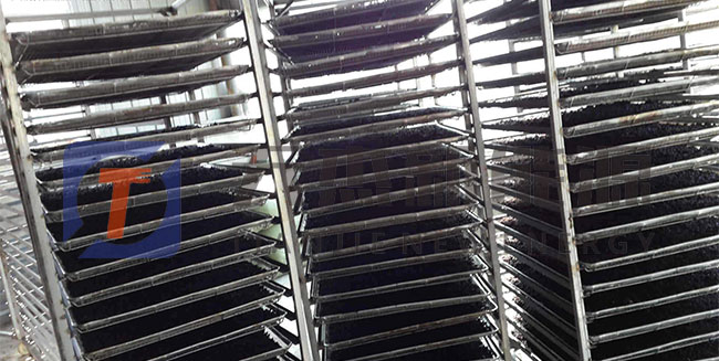 1)桑葚裝盤:使用桑椹烘干機(jī)烘干處理,時(shí)間要18個(gè)小時(shí)就可以烘干處理完了。一般每4公斤鮮桑葚可制成1公斤桑葚干。將經(jīng)整理去雜后的桑葚裝入托盤,送進(jìn)物料車內(nèi)。每臺(tái)物料車不宜超過(guò)14個(gè)托盤,托盤層間距控制在10公分左右。以10P機(jī)為例,不要超過(guò)10臺(tái)物料車,以保證桑葚烘干機(jī)內(nèi)有合理間隙位,利于熱風(fēng)通過(guò)。