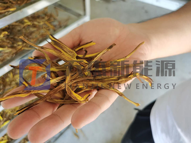 7、經(jīng)過18個小時的烘干,黃花菜已經(jīng)達到的烘干的要求,再把黃花菜烘干機的大門打開冷卻一段時間后就可以打包啦。