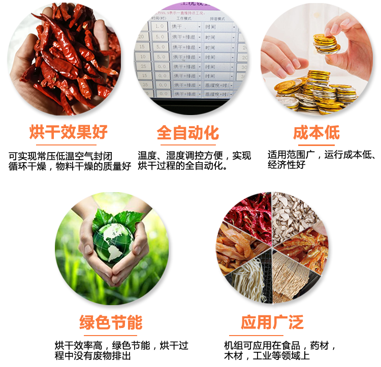 熱泵烘干機(jī)烘干出來的物料效果好,可實(shí)現(xiàn)常壓低溫空氣封閉循環(huán)干燥,物料干燥的質(zhì)量好。全自動化,烘干過程中的溫度濕度調(diào)控方便,實(shí)現(xiàn)烘干過程的全自動化。一機(jī)多用,適用范圍廣,運(yùn)行成本低,經(jīng)濟(jì)性好。烘干過程中沒有廢物排出,綠色節(jié)能,烘干效率高。熱泵烘干機(jī)可應(yīng)用在食品,藥材,木材,工業(yè)等領(lǐng)域上。歡迎您聯(lián)系我們了解中藥材烘干機(jī)、辣椒烘干機(jī)、香菇烘干機(jī)、金銀花烘干機(jī)等更多產(chǎn)品。
