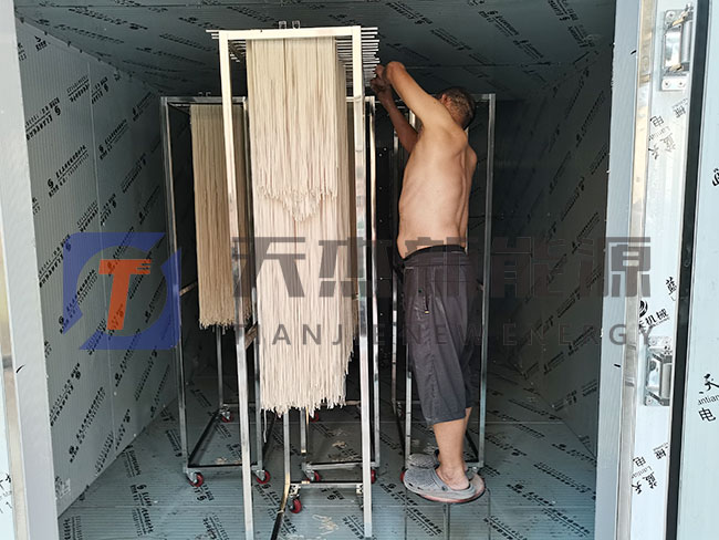 ③保住濕出汗階段:此階段后,面條內部溫度升高,內部水分轉移與表面汽化基本平衡,因此空氣能掛面烘干機此時可升高溫度、下降濕度,保證水分的大量除去。此階段溫度為 45~50t,相對濕度 55%一 60%,時間為90分鐘,水分由25%下降到16%一17%。